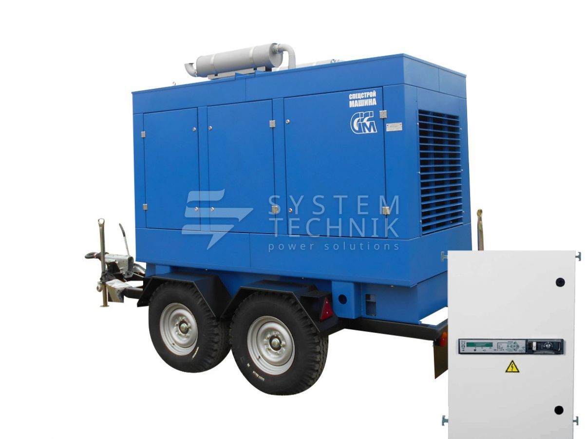 - ССМ ЭД-100-Т400-2РКМ2 в шумозащитном кожухе на шасси с АВР на прицепе